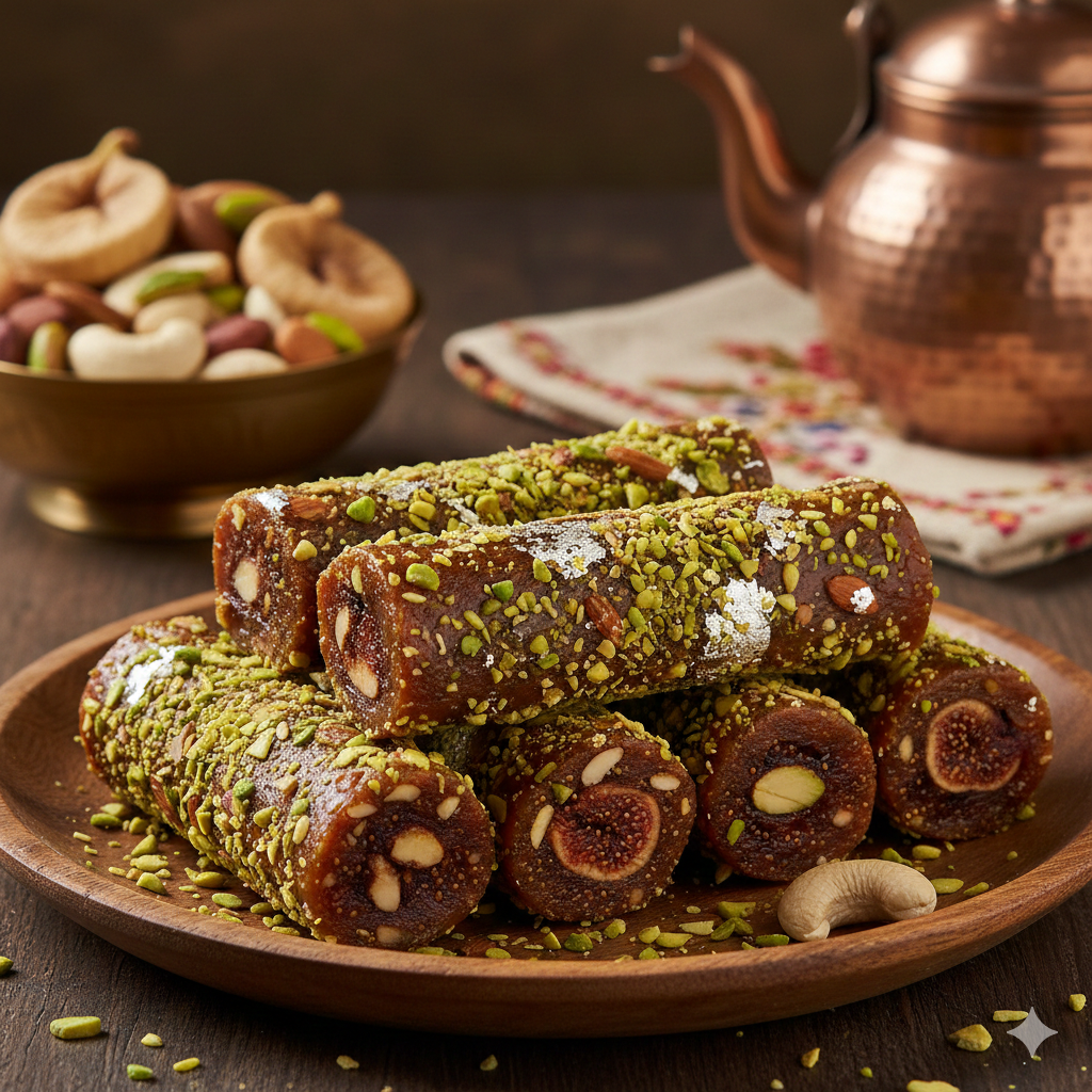 Anjeer Roll is a traditional Indian sweet made primarily from dried figs and mixed nuts. The natural sweetness of figs eliminates the need for added sugar. The mixture is shaped into cylindrical rolls and sliced into bite-sized pieces.